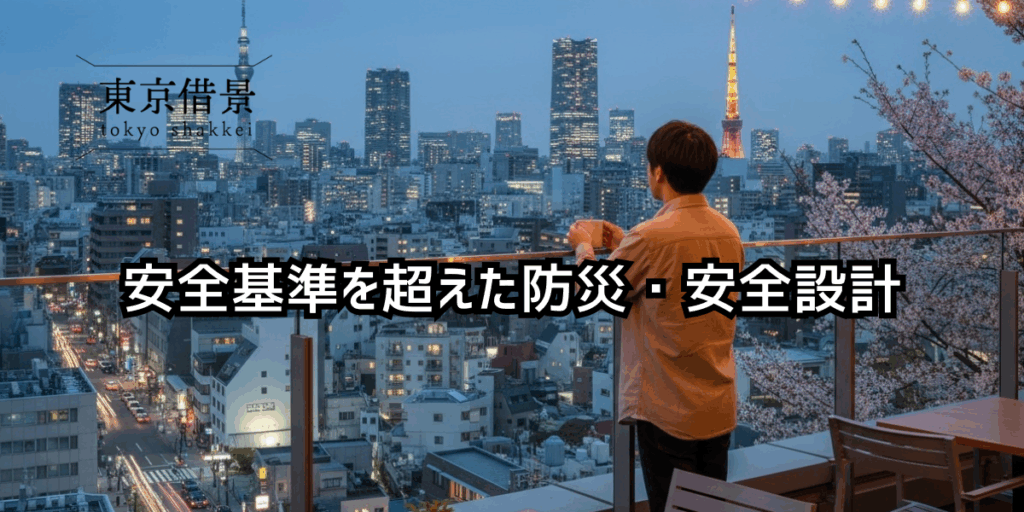 建築基準法施行令第126条により義務付けられている高さ1.1m以上の手すり設置はもちろん、東京借景では更なる安全性を追求した設計を行います。